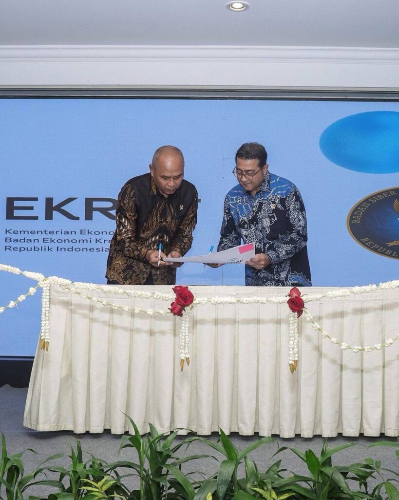 Kepala Badan Siber dan Sandi Negara (BSSN) Letjen TNI (Purn.) Drs. Nugroho Sulistyo Budi, M.M., M.Han. dan Menteri Ekonomi Kreatif H. Teuku Riefky Harsya, B.Sc., M.T. melakukan penandatanganan nota kesepahaman atau memorandum of understanding (MoU) tentang keamanan transaksi elektronik bagi ekosistem ekonomi kreatif. Penandatanganan tersebut berlangsung di Hotel Borobudur, Jakarta, pada Senin (24/3/2025).